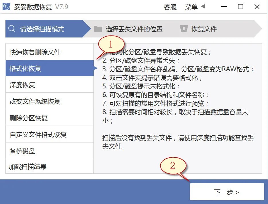 2. 点击“格式化恢复”功能,随后再点选“下一步”按钮。