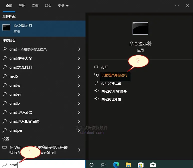 1. 在输入框中键入“cmd”指令,然后再点击以管理员权限运行。