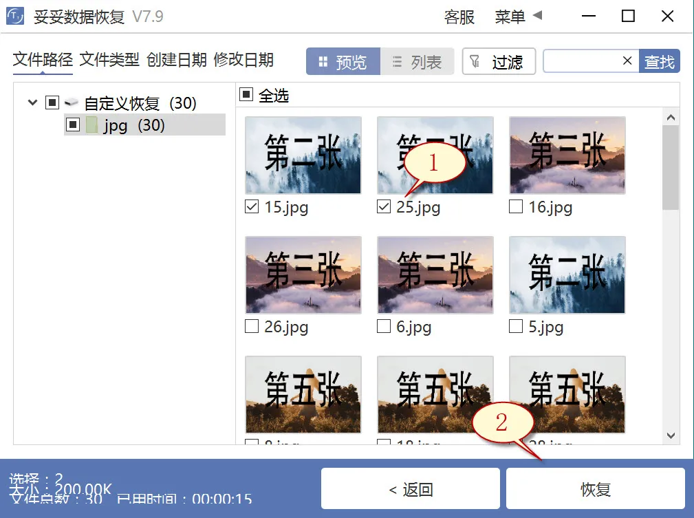 7. 点击“预览”(如图图片1所示),浏览扫描结果。选择需要找回的数据,之后点击“恢复”按钮(图2),重要文档可以成功恢复。