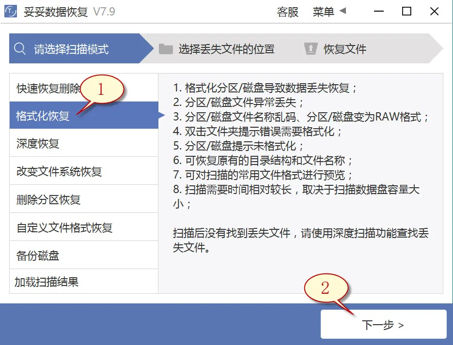 2. 点击“格式化恢复”功能,再选择“下一步”按钮。