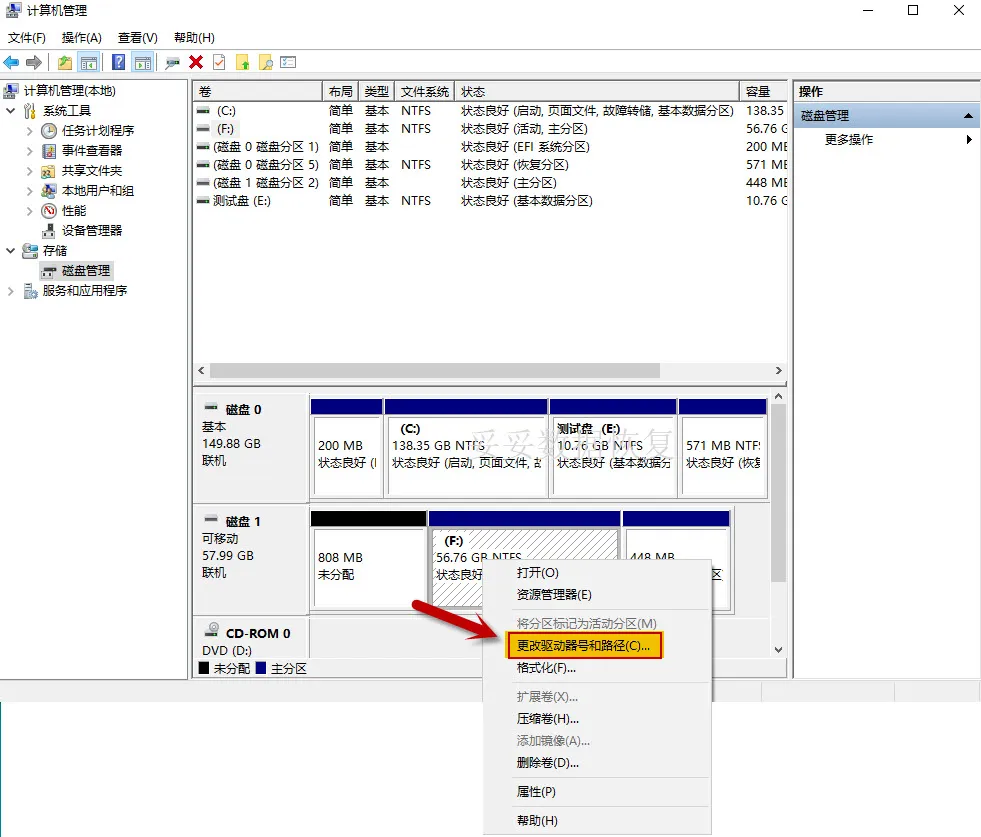2. 选择“磁盘管理”选项,随后选择U盘的驱动器,右键点击,选择“更改驱动器号和路径”来重建数据。