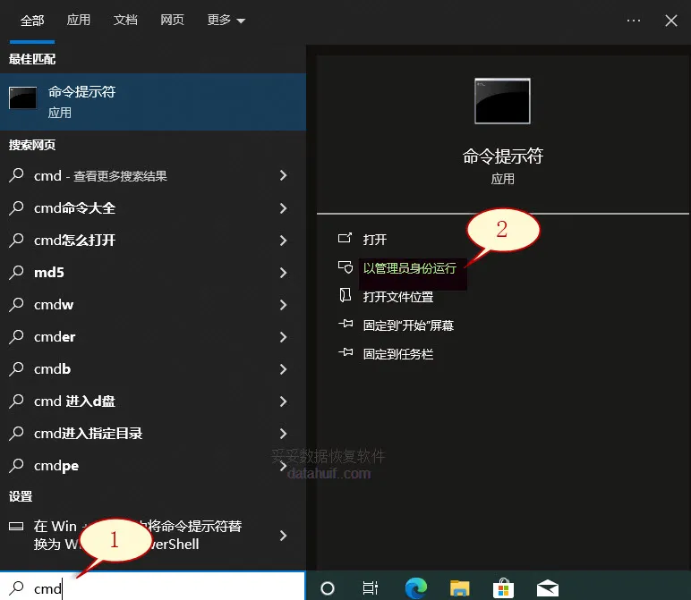 1. 在输入框中录入“cmd”命令,再选取以管理员权限运行。