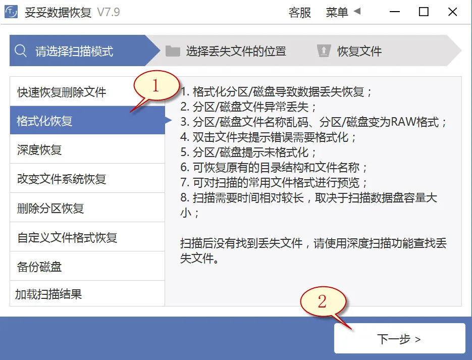 2. 点选“格式化恢复”选项,之后再选中“下一步”按钮。